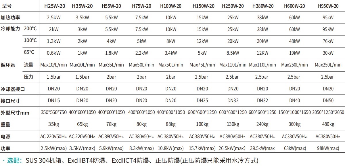 | 型號 | 加熱功率 | 冷卻能力 | 循環泵 | 冷卻器接口 | 接口尺寸 | 外型尺寸mm | 重量 | 電源 | 功率 | |||